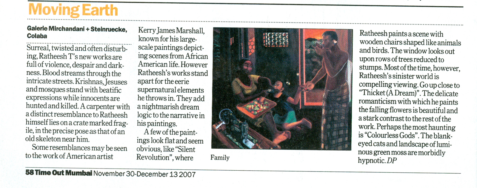 Surreal, twisted and often disturbing, Ratheesh T's new works are full of violence, despair and darkness. Blood streams through the intricate streets. Krishnas, Jesuses and mosques stand with beatific expressions while innocents are hunted and killed. A carpenter with a distinct resemblance to Ratheesh himself lies on a crate marked fragile, in the precise pose as that of an old skeleton near him.