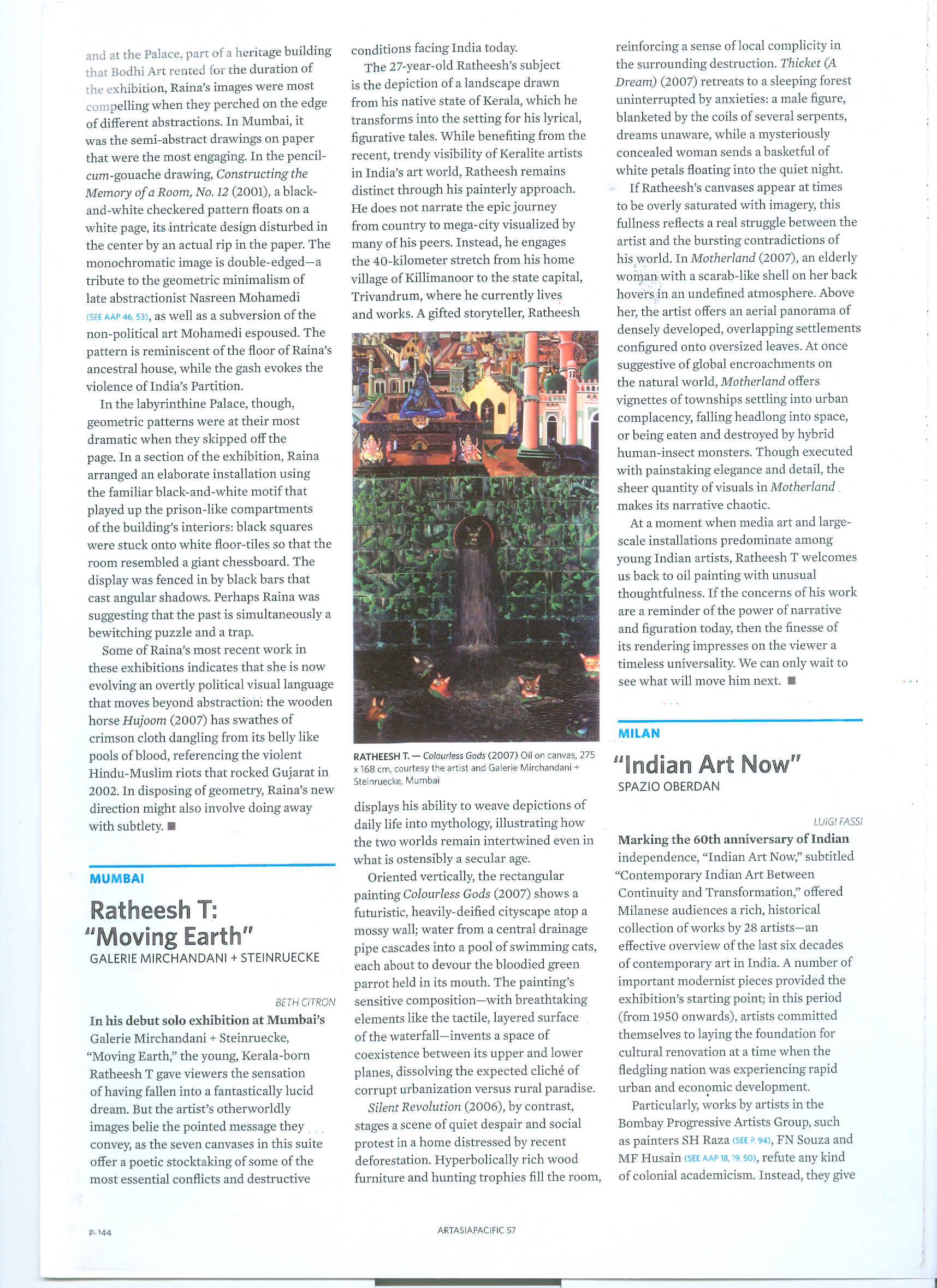 In his debut solo exhibition at Mumbai's Galerie Mirchandani + Steinruecke, "Moving Earth," the young, Kerala-born Ratheesh T gave viewers the sensation of having fallen into a fantastically lucid dream. But the artist's otherworldly images belie the pointed message they … convey, as the seven canvases in this suite offer a poetic stocktaking of some of the most essential conflicts and destructive conditions facing India today.