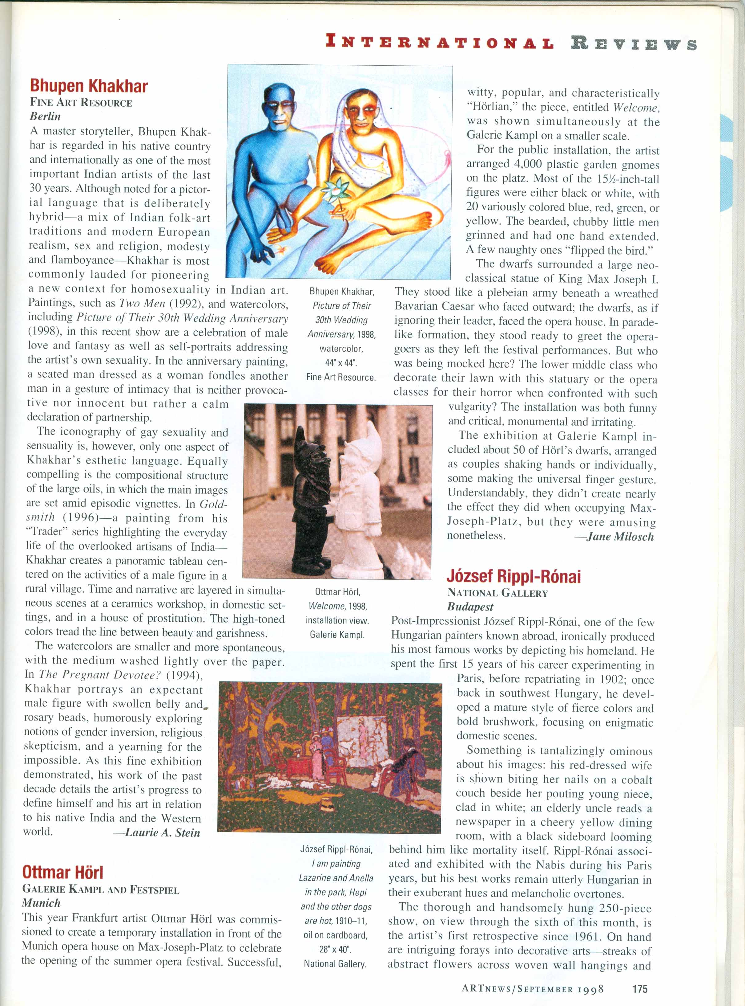 A master storyteller, Bhupen Khakhar is regarded in his native country and internationally as one of the most important Indian artists of the last 30 years. Although noted for a pictorial language that is deliberately hybrid—a mix of Indian folk-art traditions and modern European realism, sex and religion, modesty and flamboyance—Khakhar is most commonly lauded for pioneering a new contect for homosexuality in Indian art. Paintings, such as Two Men (1992), and watercolors, including Picture of Their 30th Wedding Anniversary (1998), in this recent show are a celebration of male love and fantasy as well as self-portraits addressing the artist's own sexuality. In the anniversary painting, a seated man dressed as a woman fondles another man in a gesture of intimacy that is neither provocative nor innocent but rather a calm declaration of partnership.