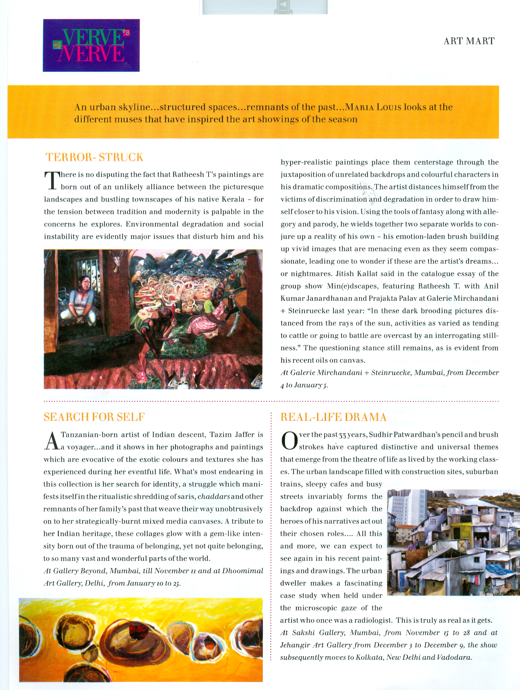 There is no disputing the fact ha Ratheesh T's paintings are born out of an unlikely alliance between the picturesque landscapes and bustling townscapes of his native Kerala - for the tension between tradition and modernity is palpable in the concerns he explores. Environmental degradation and social instability are evidentlv major issues that disturb him and his hyper-realistic paintings place them centerstage through the juxtaposition of unrelated backdrops and colourful characters in his dramatic compositions.