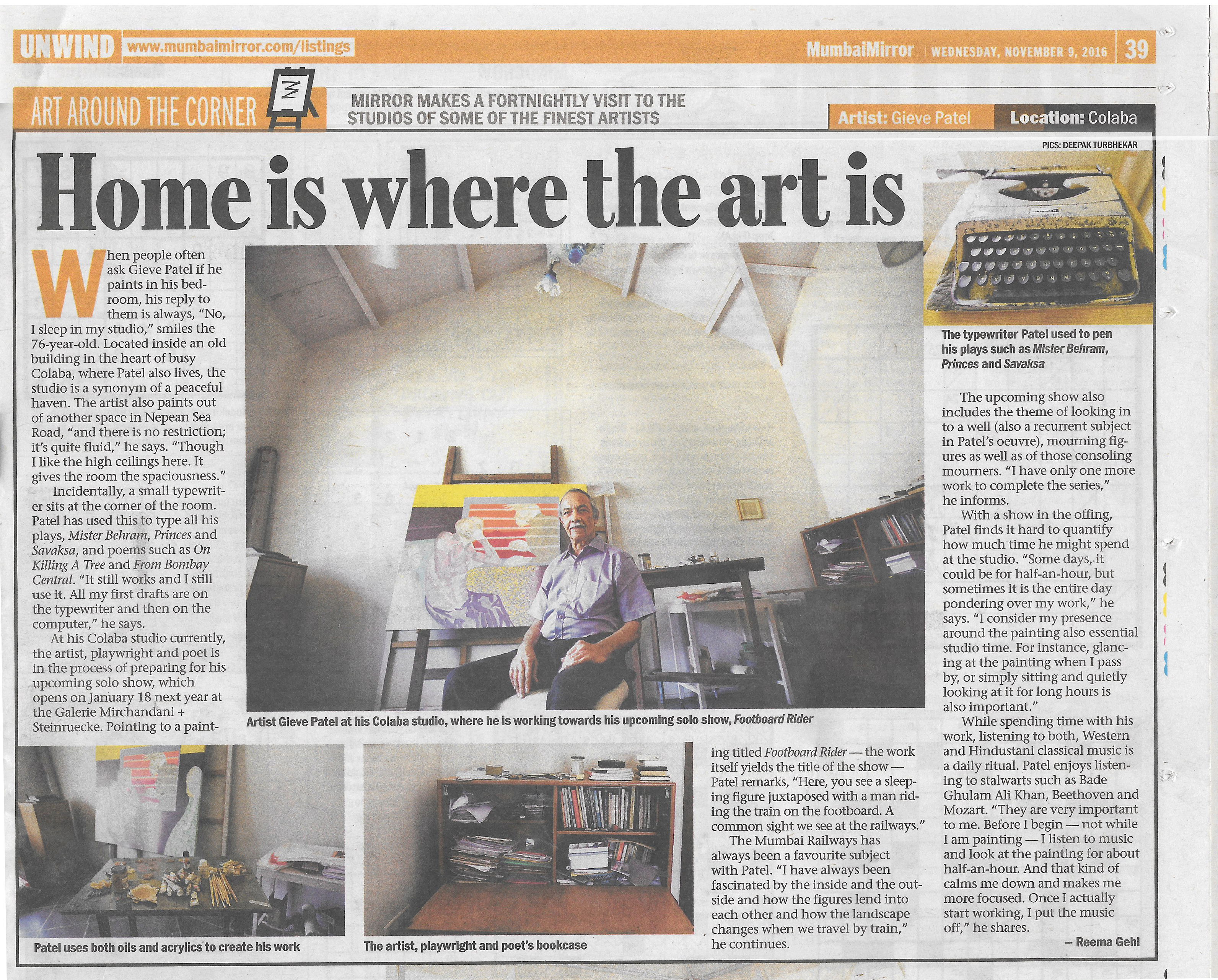 Incidentally, a small typewriter sits at the corner of the room.Patel has used this to type all his plays, Mister Behram, Princes and Savaksa, and poems such as On Killing A Tree and From Bombay Central. “It still works and I still use it. All my first drafts are on the typewriter and then on the computer,“ he says. At his Colaba studio currently, the artist, playwright and poet is in the process of preparing for his upcoming solo show, which opens on January 18 next year at the Galerie Mirchandani + Steinruecke. Pointing to a paint ing titled Footboard Rider -the work itself yields the title of the show -Patel remarks, “Here, you see a sleeping figure juxtaposed with a man riding the train on the footboard. A common sight we see at the railways.“