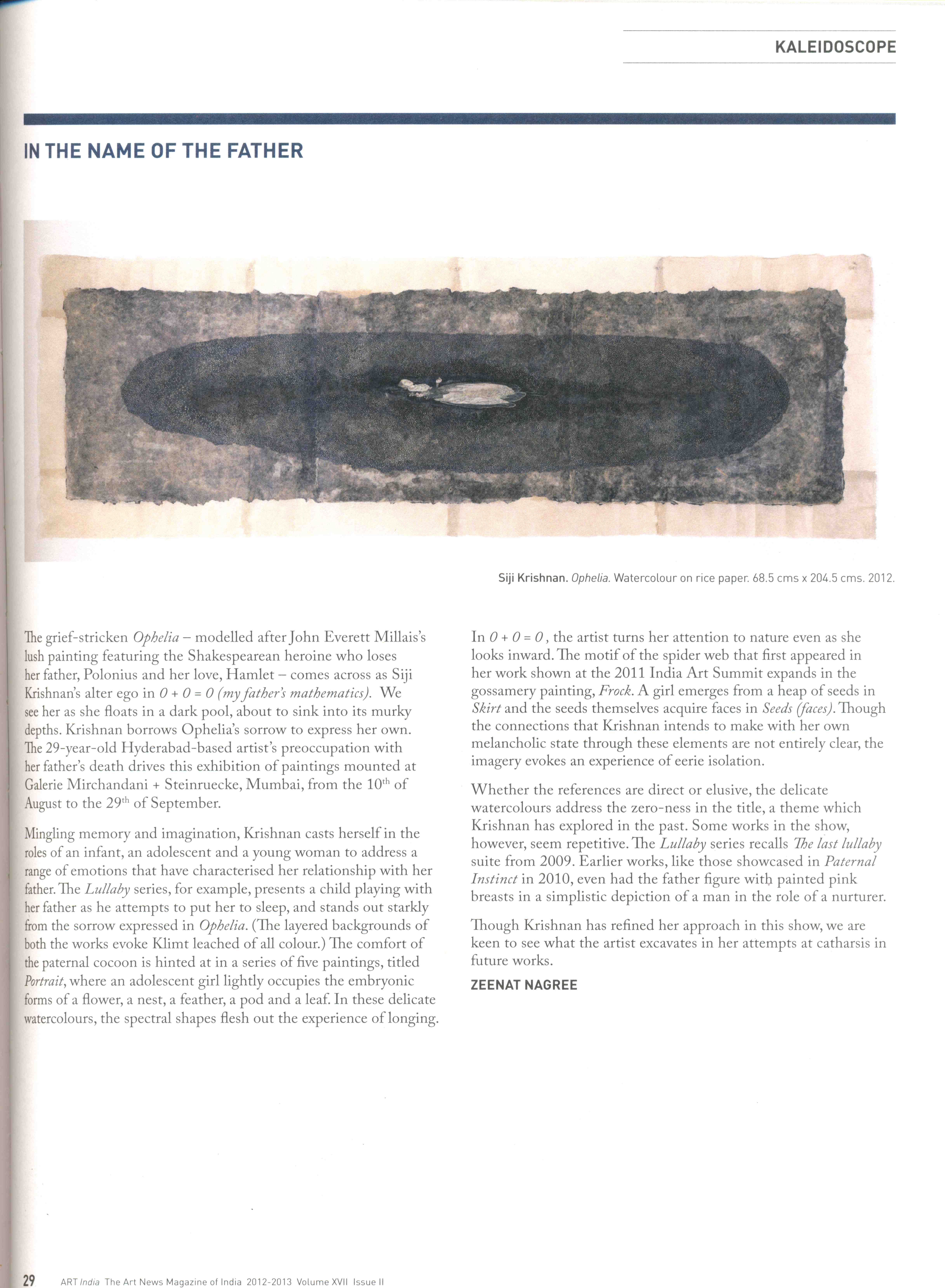 The grief-stricken Ophelia - modelled after John Everett Millais's lush painting featuring the Shakespearean heroine who loses her father, Polonius and her love, Hamlet - comes across as Siji Krishnan's alter ego in 0 + 0 = 0 (my father's mathematics). We see her as she floats in a dark pool, about to sink into its murky depths. Krishnan borrows Ophelia's sorrow to express her own. The 29-year-old Hyderabad-based artist's preoccupation with her father's death drives this exhibition of paintings mounted at Galerie Mirchandani + Steinruecke, Mumbai, from the 10th of August to the 29th of September.