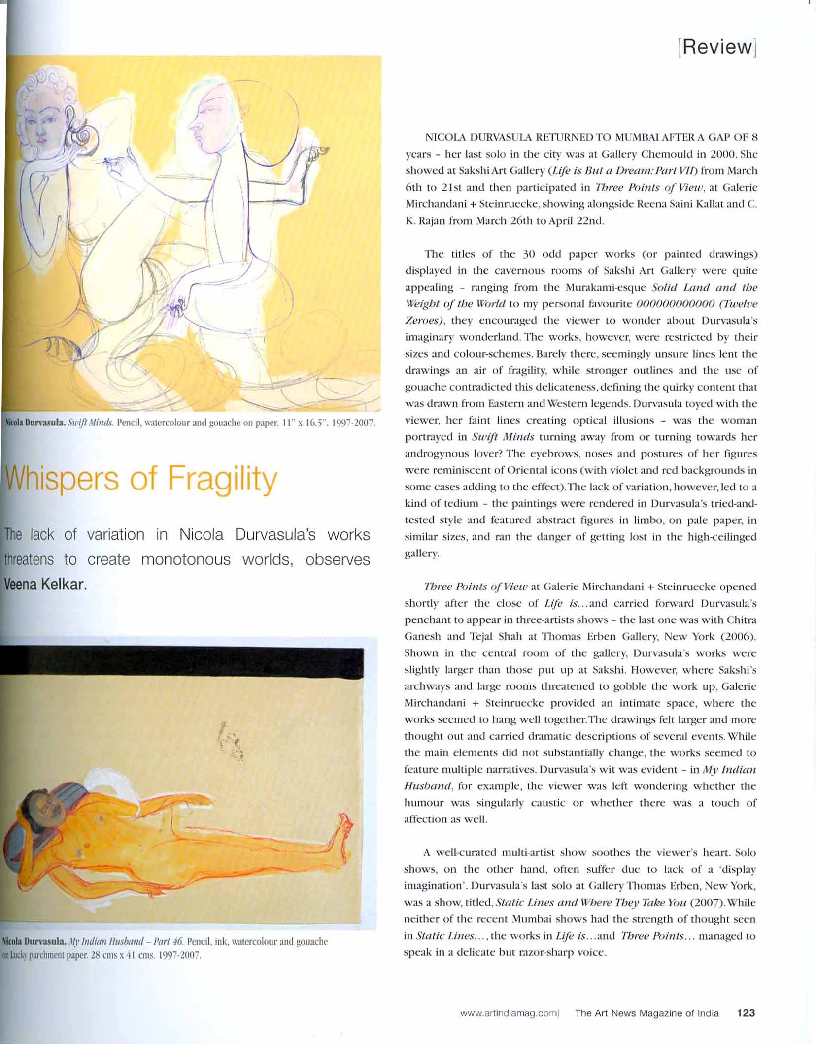 NICOLA DURVASULA RETURNED TO MUMBAI AFTER A GAP OF 8 years - her last solo in the city was at Gallery Chemould in 2000. She showed at Sakshi Art Gallery (Life is But a Dream: Part VID from March 6th to 21st and then participated in Three Points of View, at Galerie Mirchandani + Steinruecke, showing alongside Reena Saini Kallat and C.K. Rajan from March 26th to April 22nd.